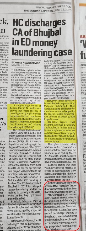 HC discharges CA of Bhujbal in ED money laundering case CA Dungar Chand U Jain | June 23, 2025 | General | No Comments 129 Related Posts RBI imposes moratoium on Yes Bank; caps withdrawals at Rs 50,000 No Comments | Mar 9, 2020 Tamil Nadu: Air travellers should show 1 of 5 ID cards No Comments | Aug 26, 2019 PAN-Aadhaar linking deadline extended to June 30, 2021 No Comments | Apr 10, 2021 Comprehensive Cyber Security Audit Policy Guidelines No Comments | Jul 30, 2025 About The Author CA Dungar Chand U Jain Add a Comment Cancel replyYour email address will not be published. Required fields are marked *Comment:*Name:* Email Address:* Website: