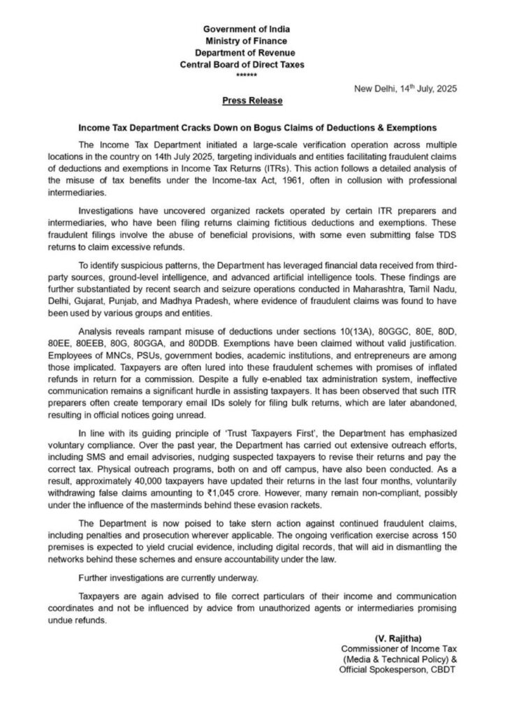 Income Tax Department Cracks Down on Bogus Claims of Deductions & Exemptions CA Dungar Chand U Jain | July 17, 2025 | Income Tax | No Comments 204 Related Posts A Bird’s Eye View of HUF Taxation in India No Comments | Dec 10, 2019 Reporting interest income: I-T Dept message to ‘revise’ ITR baffles tax payers No Comments | Apr 10, 2021 Computation of Capital gains on amounts received under ULIP No Comments | Jan 20, 2022 SC fines Income Tax Dept ₹10 lakh, says court not a picnic spot No Comments | Sep 4, 2018 About The Author CA Dungar Chand U Jain Add a Comment Cancel replyYour email address will not be published. Required fields are marked *Comment:*Name:* Email Address:* Website: