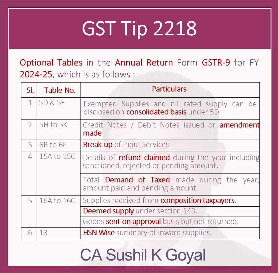 Optional Tables in the Annual Return form GSTR-9 for FY 2024-25 CA Dungar Chand U Jain | January 16, 2026 | GST | No Comments 114 Related Posts Simpler GST turns out to be bad business for India’s tax consultants No Comments | Mar 19, 2019 ADVISORY ON SEQUENTIAL FILLING OF GSTR-1 No Comments | Oct 26, 2022 Businesses face losses in tax credits on supplier’s defaults No Comments | Apr 13, 2021 Supreme Court upholds buyers can correct clerical errors in GST filings without penalty, claim ITC No Comments | May 6, 2025 About The Author CA Dungar Chand U Jain Add a Comment Cancel replyYour email address will not be published. Required fields are marked *Comment:*Name:* Email Address:* Website: