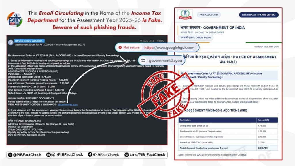 An email is circulating online claiming to be issued by the Income Tax Department for Assessment Year 2025–26. The email further asks recipients to pay a tax demand and directs them to click a link to view an ‘Assessment Order.’