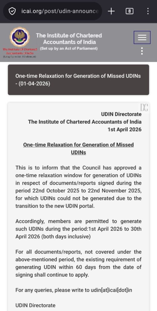 UDINs for documents signed between 22 Oct – 22 Nov 2025 can now be generated from 1–30 April 2026.